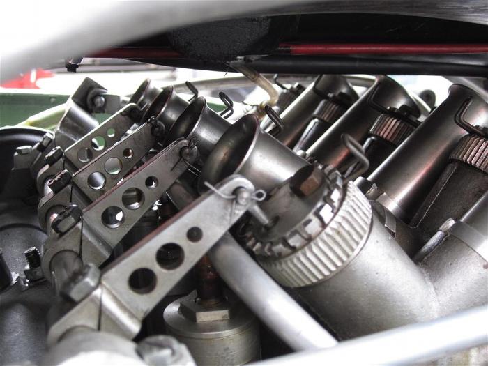 Vergaserbatterie einer der wenigen Moto Guzzi 500 ccm V8-Rennmaschinen, gesehen in Spa (Bikers Classics 2010)